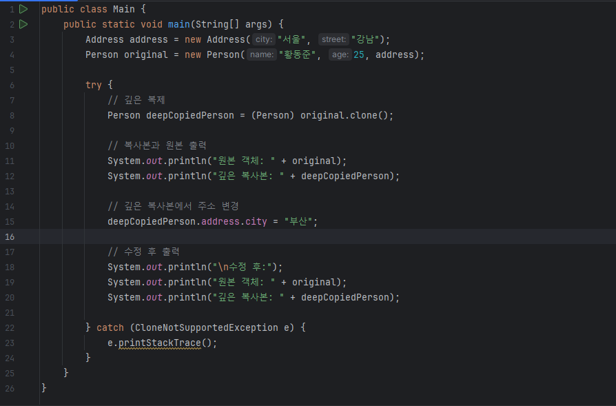 Address 와 Person 클래스의 객체를 생성했고, clone 메소드를 사용하기 위해 try catch 문으로 CloneNotSupportedException