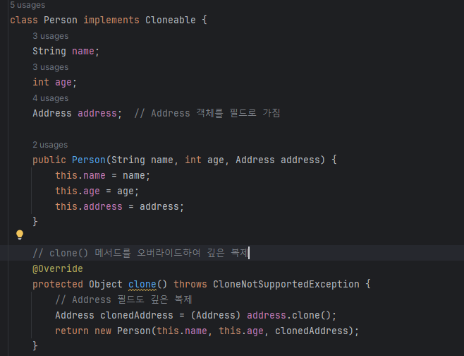 이제 클론 메소드를 사용해서 deepCopiedPerson 이라는 객체를 생성했는데, clone 메소드가 Object 클래스에 정의되어 있기 때문에, 우리는 Person 타입을 반환해야 하기 때문에 반환값을 Person 타입으로 바꿔주기 위해 다운캐스팅을 했습니다.